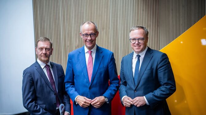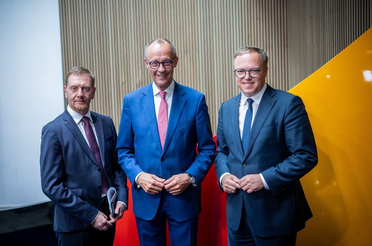 Friedrich Merz (Mitte), CDU Bundesvorsitzendermit Michael Kretschmer (CDU, links), Ministerpräsident von Sachsen, und Mario Voigt, CDU Landesvorsitzender in Thüringen.