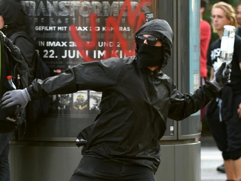 Ein maskierter Demonstrant wirft eine Flasche auf Polizeikräfte in Hamburg. Die Union fordert eine »europäische Extremistendatei für Linksradikale«. Foto: Axel Heimken