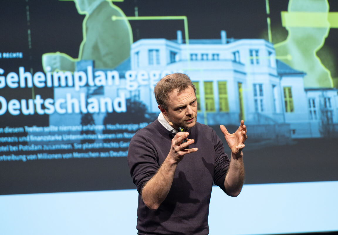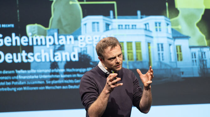 Jean Peters leitete damals die investigative Recherche zum Treffen der Rechtsextremen in Potsdam, in deren Folge Millionen von Menschen in ganz Deutschland für Demokratie und Menschenrechte auf die Straßen gingen. In Reutlingen legt er seine Clownsbrille ab und skizziert den rund 250 Interessierten, wie die Recherche ablief. Peters, dessen Name ein Pseudonym ist, befand sich im Oktober auf Sizilien, als eine entscheidende Nachricht auf seinem Handy "aufploppte", so erzählt er. Darin ein Brief, in dem zwei Männer, Gernot Mörig, ein rechtsextremer Zahnarzt, und Hans-Christian Limmer, ein bekannter Investor im Gastro-Bereich, zu einem Treffen innerhalb der rechten Szene einladen. "Sie luden zu einem patriotischen Treffen ein, bei dem sie Deutschland retten, einen Masterplan aufstellen und eine Strategie planen wollten