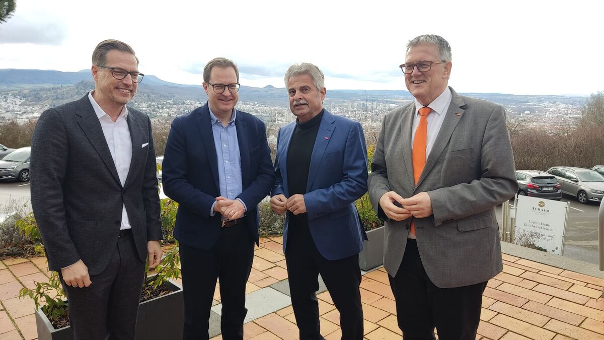 Robin Morgenstern, Regionalvorsitzender der Familienunternehmer/Jungen Unternehmer, Martin Huber, seit 2022 CSU-Generalsekretär, Moderator Rainer Knauer und der Reutlinger CDU-Bundestagsabgeordnete Michael Donth (von links). FOTO: RAHMIG