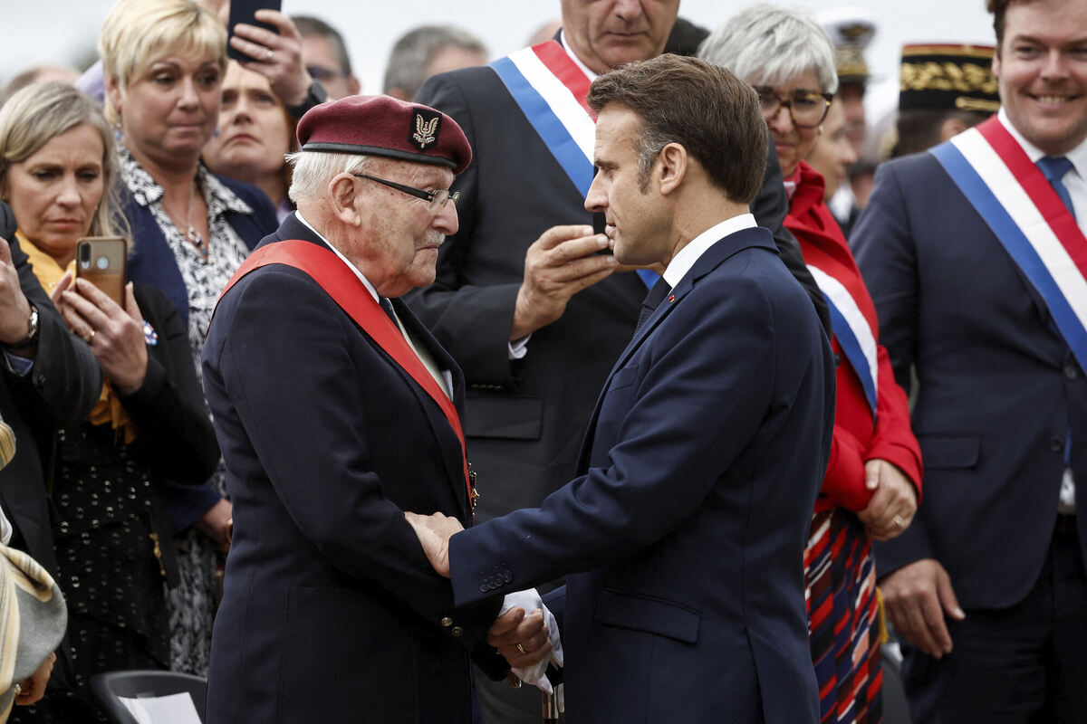 Emmanuel Macron ehrt einen D-Day-Veteranen.