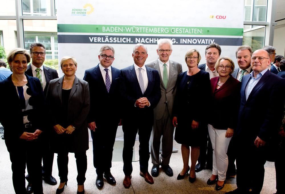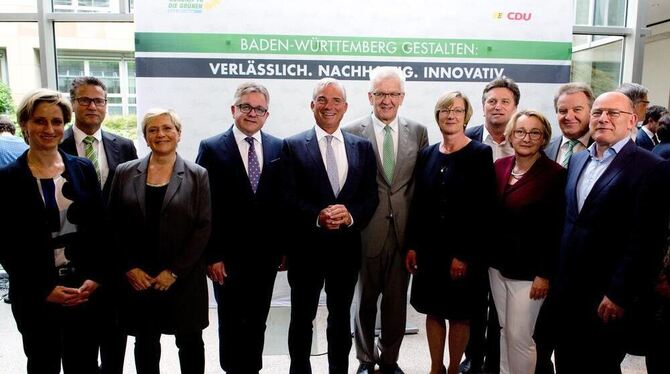 Die designierten Minister der grün-schwarzen Landesregierung von Baden-Württemberg (v.l.): Nicole Hoffmeister-Kraut (CDU, Wirtschaft), Peter Hauk (CDU, Ernährung und ländlicher Raum), Susanne Eisenmann (CDU, Kultus), Guido Wolf (CDU, Justiz, Europa und Tourismus), Thomas Strobl (CDU, Inneres), Winfried Kretschmann (Bündnis 90 / Die Grünen, Ministerpräsident), Edith Sitzmann (Bündnis 90 / Die Grünen, Finanzen), Manfred Lucha (Bündnis 90 / Die Grünen, Soziales), Theresia Bauer (Bündnis 90 / Die Grünen, Wissenschaft), Franz Untersteller (Bündnis 90 / Die Grünen, Umwelt) und Winfried Hermann (Bündnis 90 / Die Grünen, Verkehr)