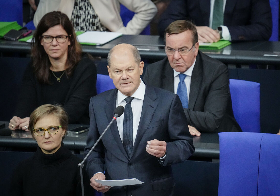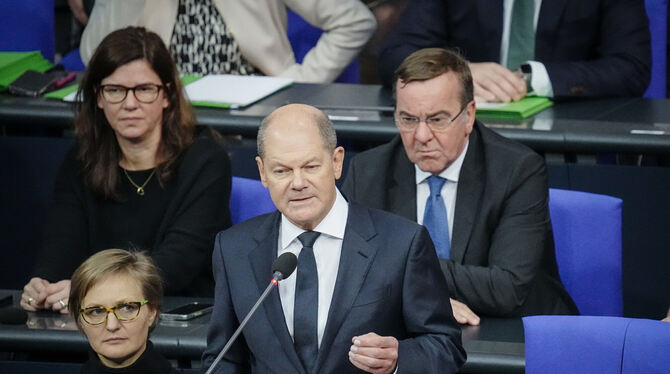 Klare Worte von Kanzler Olaf Scholz (SPD) im Bundestag. Hinter ihm sein Verteidigungsminister Boris Pistorius, den mancher als nächsten Kanzlerkandidaten sieht. FOTO: NIETFELD/DPA