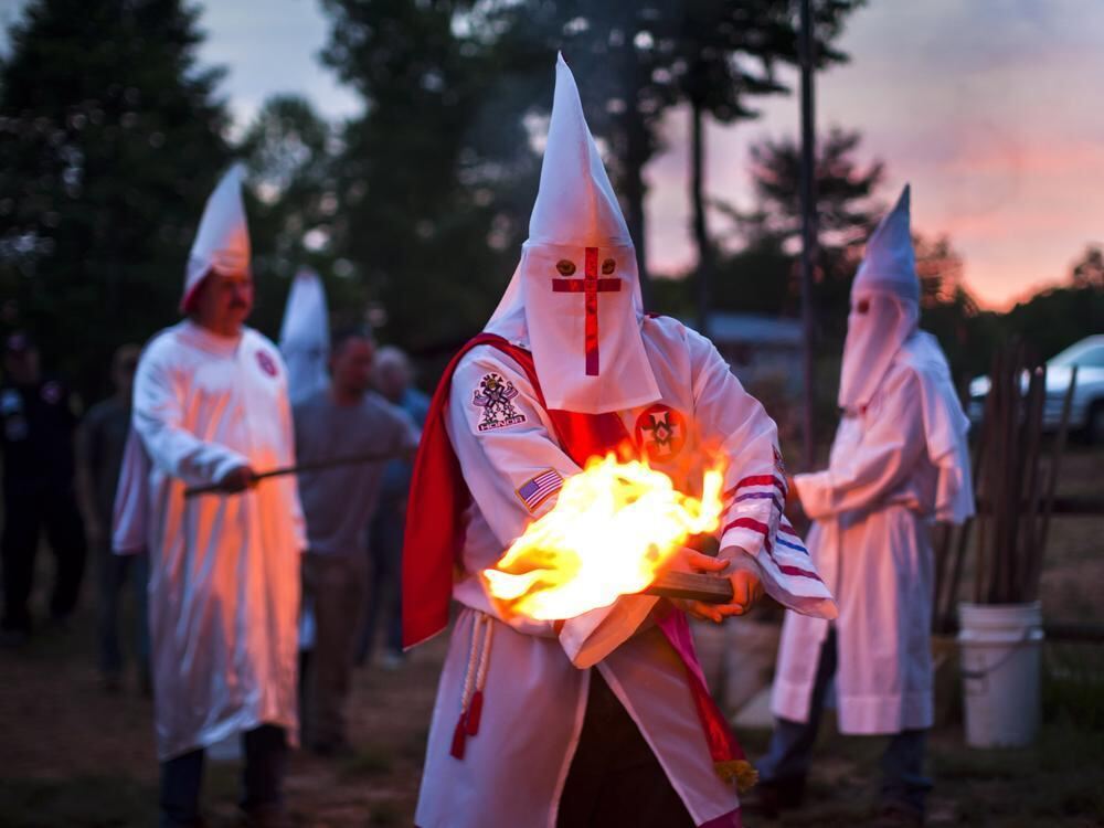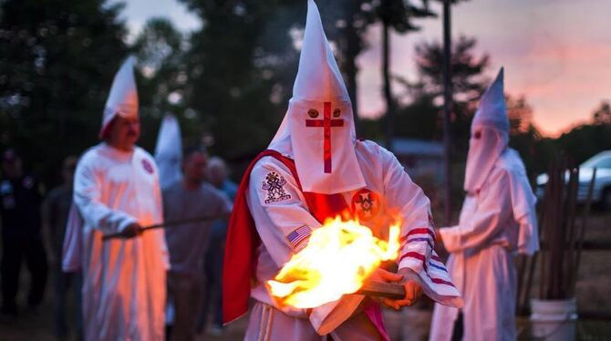 Mitglieder der »Rebel Brigade Knights« des Ku-Klux-Klan nehmen an einer Zeremonie des Ku-Klux-Klan in Martinsville, Virginia, USA teil.