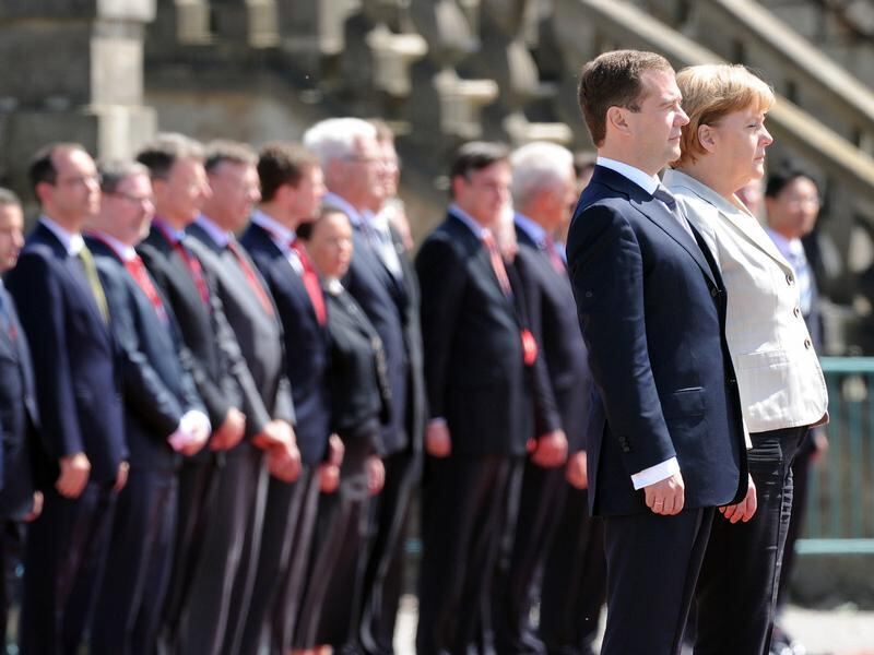 Der russische Präsident Dmitri Medwedew und Bundeskanzlerin Angela Merkel nehmen während der Deutsch-Russischen Regierungskonsultationen an den Militärischen Ehren in den Herrenhäuser Gärten in Hannover teil. Foto: Caroline Seidel, dpa
