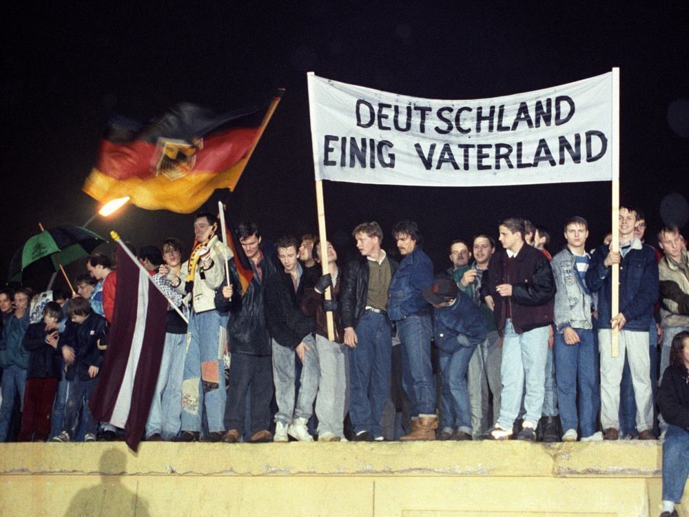Mit der Deutschlandfahne und einem Transparent »Deutschland einig Vaterland« stehen Berliner am 1989 auf der Berliner Mauer am Brandenburger Tor.