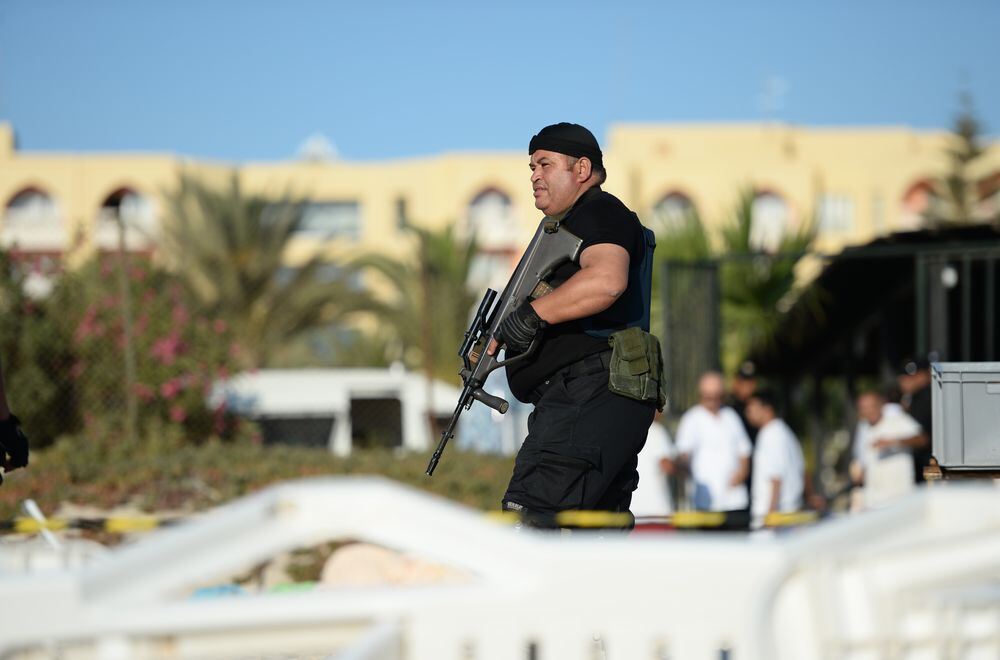 Ein bewaffneter Polizist steht am Strand vor dem Imperial Marhaba Hotels in Sousse. Mindestens 39 Menschen starben bei dem Terroranschlag im tunesischen Badeort Sousse - größtenteils Urlauber. Foto: Andreas Gebert/dpa
