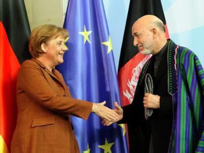 Bundeskanzlerin Angela Merkel (CDU) und der Präsident Afghanistans, Hamid Karsai, im Bundeskanzleramt in Berlin.