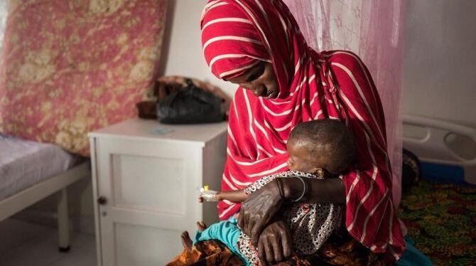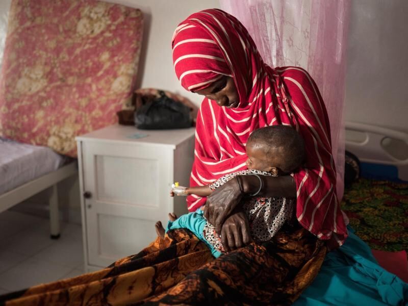 Eine Frau mit ihrer neun Monate alten Tochter im Krankenhaus in Garowe im Norden Somalias. Die 28-Jährige brachte das unterernährte Kind auf einer sieben Stunden langen Fahrt mit dem Lastwagen zur Behandlung. Foto: Anna Mayumi Kerber