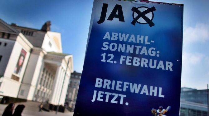 Ein Plakat, das zur Teilnahme am Abwahlverfahren des Duisburger Oberbürgermeisters Sauerland auffordert. Foto: Oliver Berg