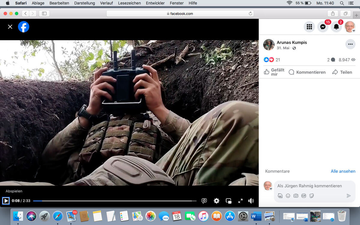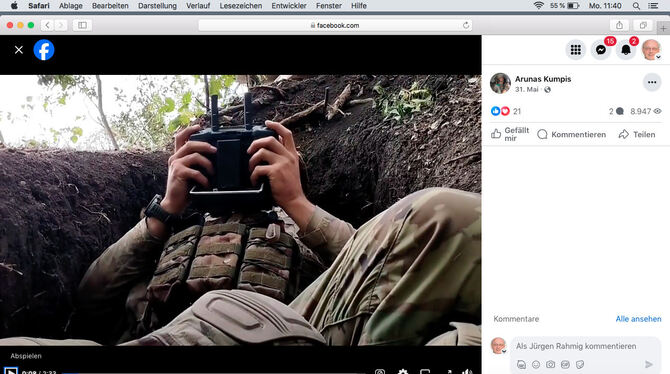 Eine Drohne wird vom Soldaten aus dem Schützengraben gesteuert.