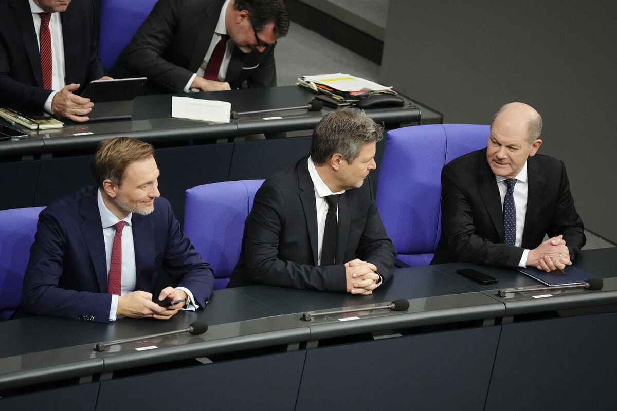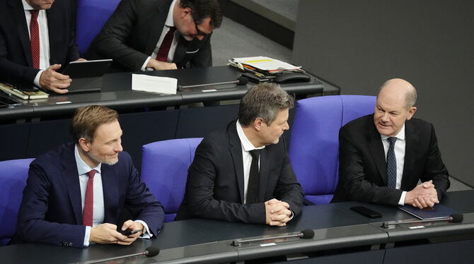 Christian Lindner (l-r, FDP), Bundesminister der Finanzen, Robert Habeck (Grüne), Bundesminister für Wirtschaft und Klimaschutz, und Bundeskanzler Olaf Scholz (SPD) haben sehr lange beraten, um einen Sparplan hinzubekommen.