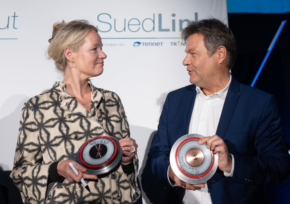 Bundeswirtschaftsminister Robert Habeck (Bündnis 90/Die Grünen, r) und Thekla Walker (Bündnis 90/Die Grünen), Umweltministerin von Baden-Württemberg, nehmen an einer Auftaktveranstaltung für den Bau des ersten Konverters für die wichtige Suedlink-Stromtrasse teil. Habeck setzt seine Ländertour mit Terminen in Baden-Württemberg fort.