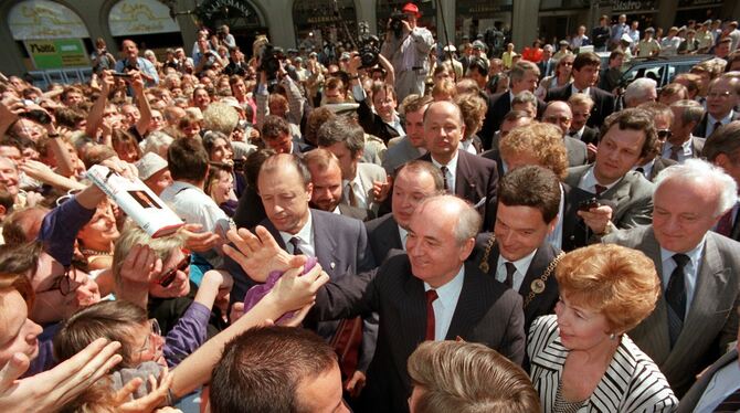 Wegen seiner Verdienste um die Deutsche Einheit und die Überwindung der europäischen Spaltung ist Gorbatschow – hier 1989 beim Bad in der Menge – in Deutschland sehr populär. Vor allem die Ostdeutschen nennen ihn liebevoll »Gorbi«. Für seinen Beitrag zur Entspannungspolitik zwischen Ost und West wurde er 1990 mit dem Friedensnobelpreis geehrt.
