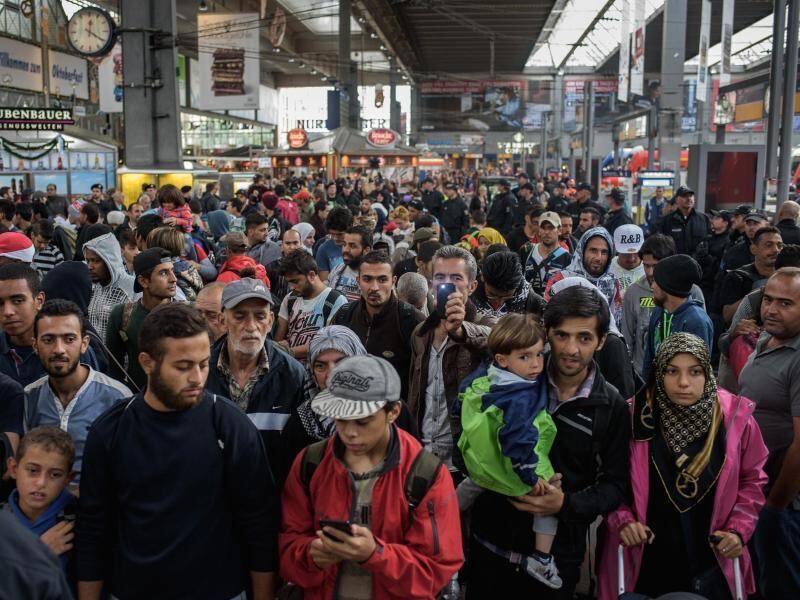 Flüchtlinge, die mit dem Zug angereist sind, werden am Hauptbahnhof in München von der Bundespolizei zur Weiterverteilung in verschiedene Erstaufnahmeeinrichtungen begleitet. Foto: Nicolas Armer