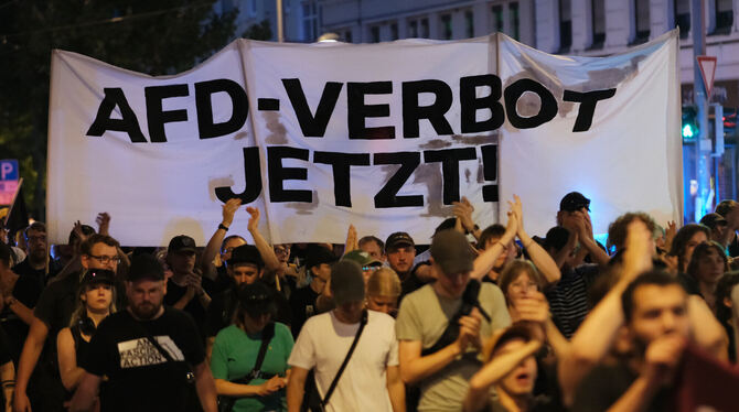Teilnehmer einer linken Demonstration gehen mit Transparent mit der Aufschrift »AfD-Verbot jetzt!« eine Straße entlang. FOTO: WILL/DPA