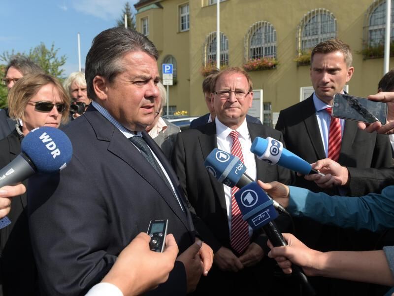 Bundeswirtschaftsminister Sigmar Gabriel (l, daneben Heidenaus Bürgermeister Jürgen Opitz) spricht mit Pressvertretern. Foto: Rainer Jensen