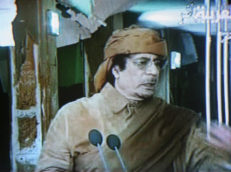 Libyens Staatschef Muammar al-Gaddafi in seiner Fernsehansprache (TV-Aufnahme vom Nachrichtensender al-Arabiya)