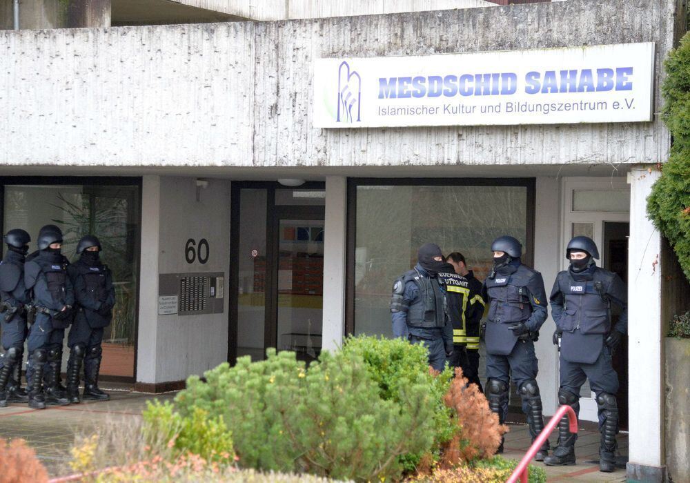 Polizisten stehen vor dem Eingang des »Islamisches Bildungs- und Kulturzentrum Mesdschid Sahabe e.V.« in Stuttgart.