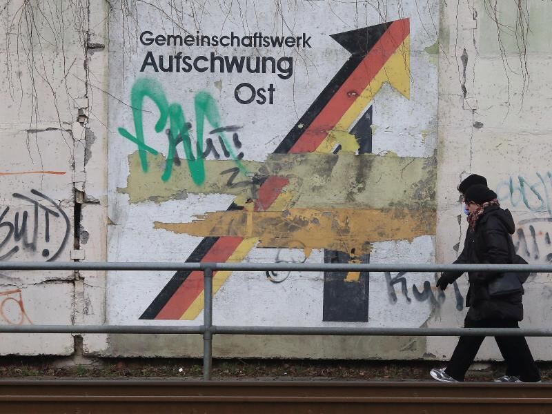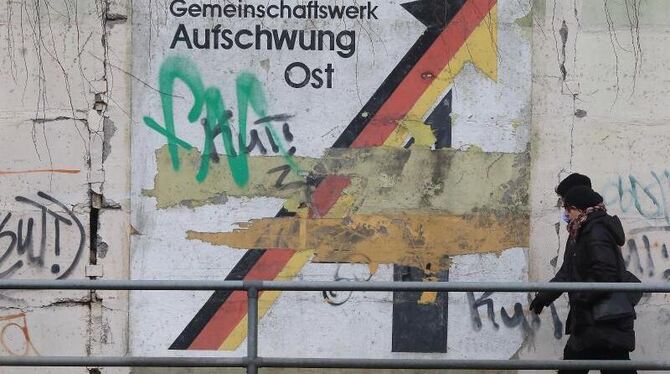 Der Schriftzug »Gemeinschaftswerk Aufschwung Ost« in Magdeburg: Auch Baden-Württemberg denkt jetzt über eine Klage gegen den Länderfinanzausgleich nach. Foto: Jens Wolf/Archiv