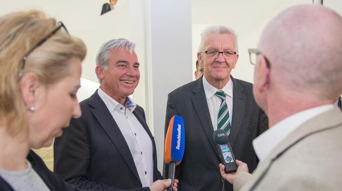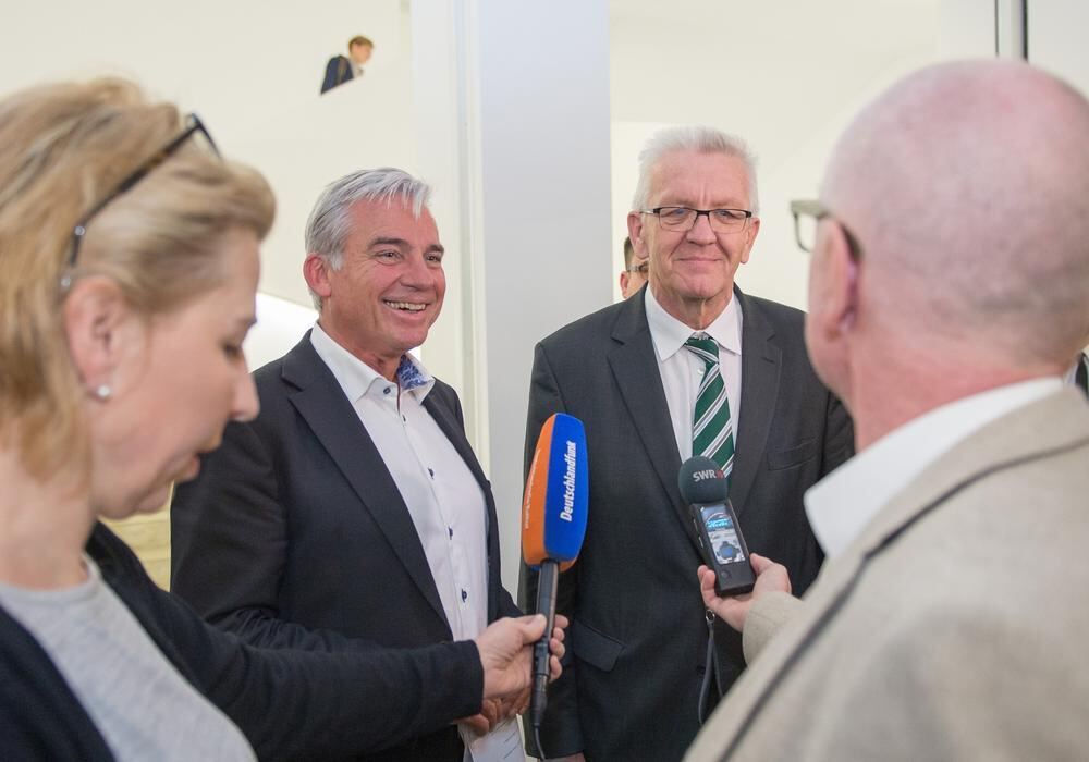 Der Landesvorsitzende der CDU Baden-Württemberg, Thomas Strobl (2.v.l.), und Winfried Kretschmann (2.v.r.), Ministerpräsident von Baden-Württemberg (Bündnis 90/Die Grünen), geben nach der Großen Koalitionsrunde zu den Koalitionsverhandlungen ein Statement.
