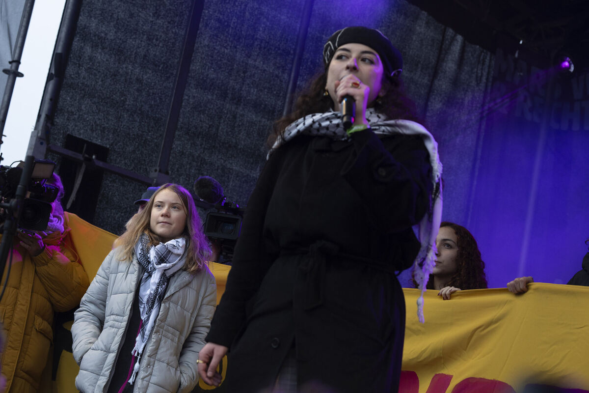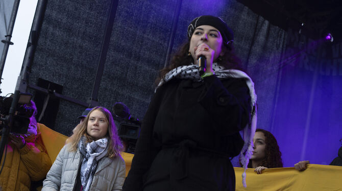 Die schwedische Klimaaktivistin Greta Thunberg (links) steht in Amsterdam bei einer Klimademo neben der Palästina-Aktivistin Sara Rachdan auf der Bühne.