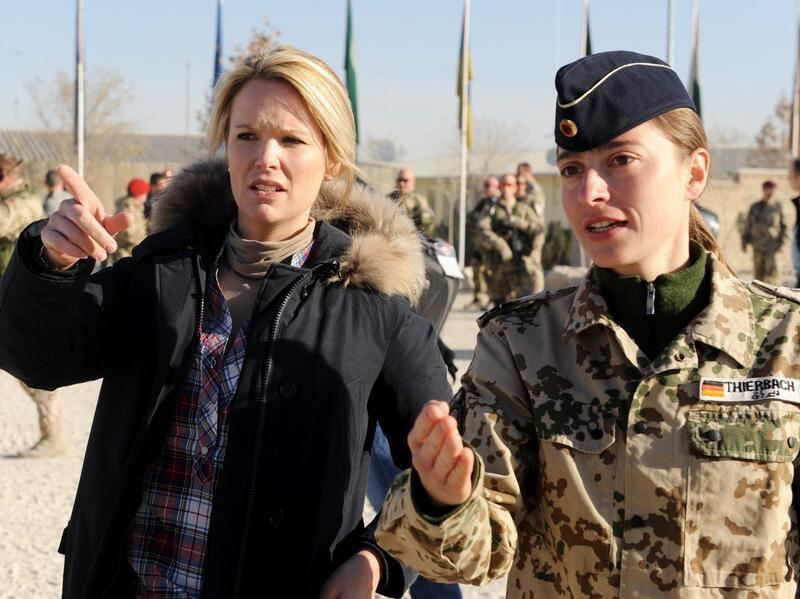 Stephanie zu Guttenberg lauscht im Feldlager Kundus den Erklärungen einer Soldatin.