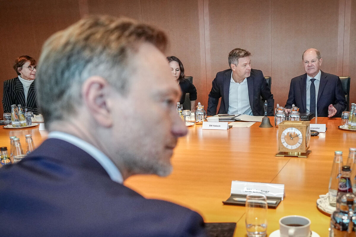 Die Ampel-Koalitionäre, allen voran Finanzminister Lindner (vorne) und Kanzler Scholz (hinten rechts), haben keinen verfassungskonformen Haushalt für 2024 vorgelegt.