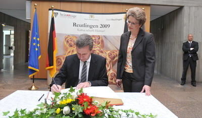 Ministerpräsident Günther Oettinger trägt sich in das Goldene Buch der Stadt Reutlingen ein.