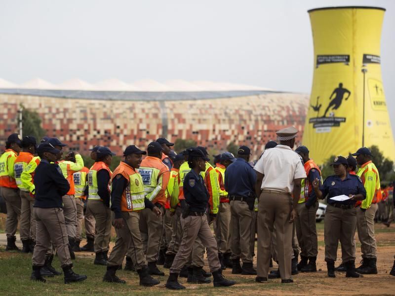 In Vorbereitung der Trauerfeier werden Polizisten vor dem FNB-Stadion eingewiesen. Foto: Ian Langsdon