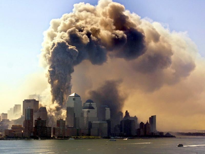 Ein Turm des World Trade Centers in New York stürzt ein und eine Wolke aus Staub, Rauch und Asche steigt in die Luft (Archivfoto vom 11.09.2001).