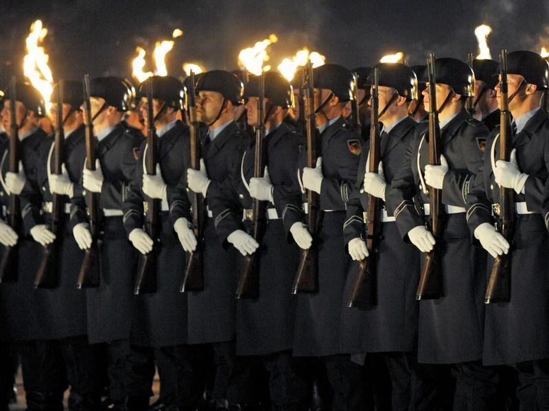 Soldaten des Wachbataillons sind auf dem Gelände des Verteidigungsministeriums in Berlin für einen Großen Zapfenstreich aufmarschiert. Foto: Maurizio Gambarini/Archiv