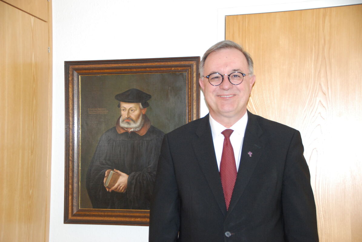 Bischof Frank Otfried July in seinem Stuttgarter Amtszimmer neben einem Porträt des Reformators Johannes Brenz. FOTO: SCHÜRER