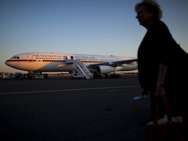 Mitglieder der Reisedelegation auf dem Weg zum Regierungsflugzeug »Konrad Adenauer«.