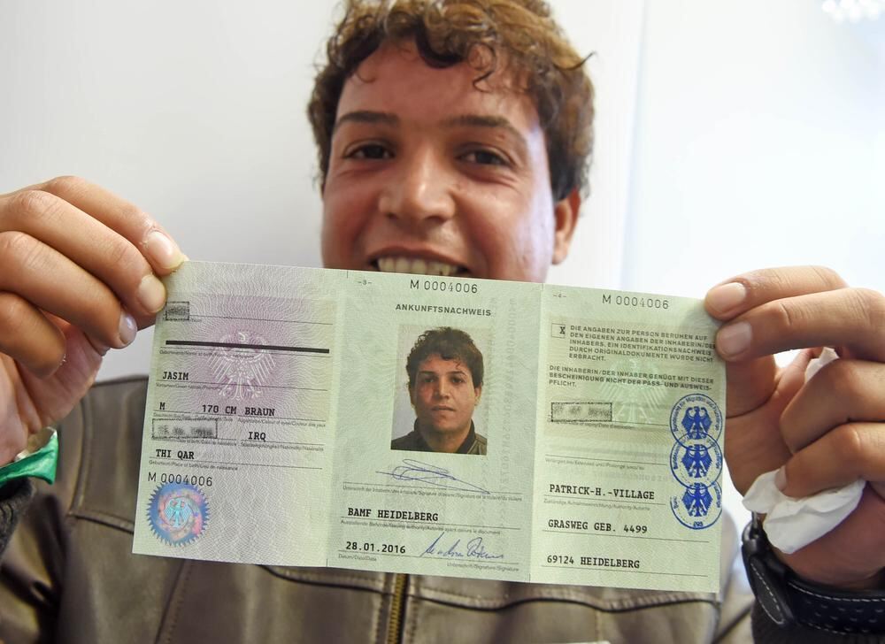 Jasmin A., Flüchtling aus dem Irak, zeigt im Registrierungszentrum in der Patrick-Henry-Village in Heidelberg seinen Ankunftsnachweis (Flüchtlingsausweis), den er dort erhalten hat.