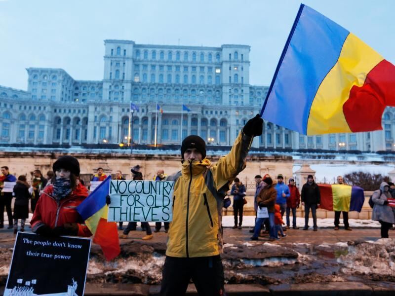 Demonstranten stehen in Bukarest vor dem Parlamentspalast. Archiv-Foto: Darko Bandic