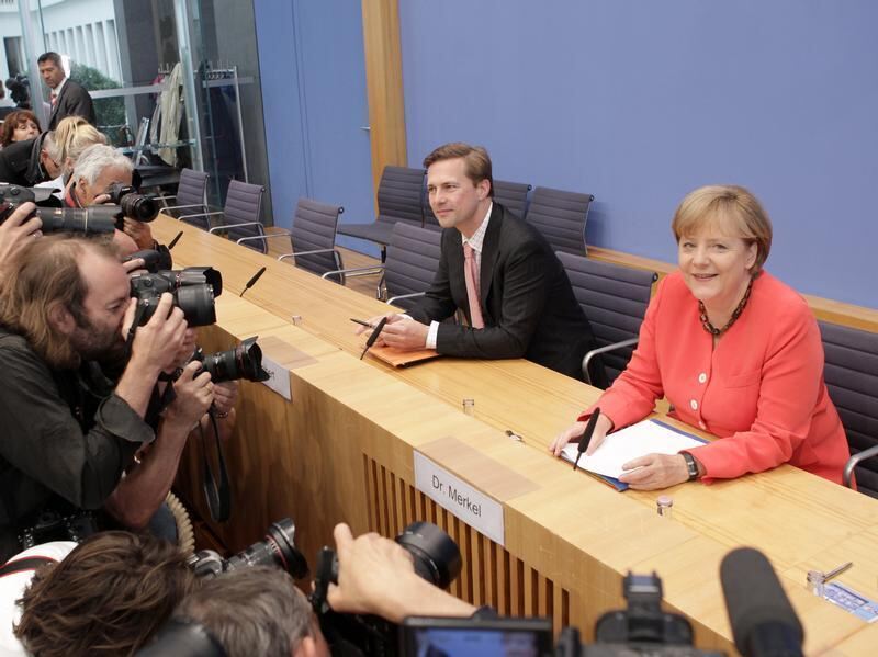 Bundeskanzlerin Angela Merkel mit Regierungssprecher Steffen Seibert in der Bundespressekonferenz in Berlin.