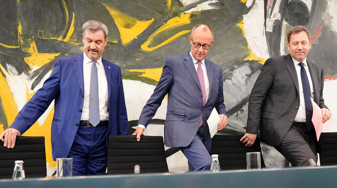 Blick nach vorn: Die Parteichefs Markus Söder (CSU, von links nach rechts), Friedrich Merz (CDU) und Lars Klingbeil (SPD) stellen das Arbeitsprogramm der schwarz-roten Regierungskoalition vor.