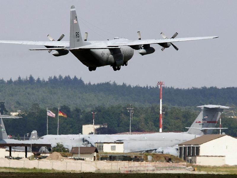Eine Transportmaschine der US-Luftwaffe überfliegt den US-Flughafen Ramstein. Foto: Ronald Wittek/Archiv