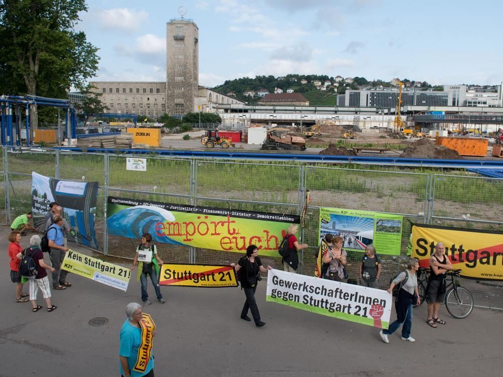 Vorne ein paar Demonstranten, hinter dem Zaun die Baustelle von Stuttgart 21.