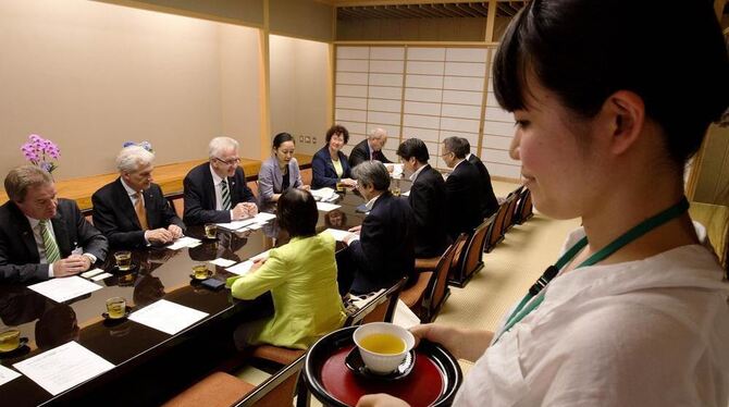 Bundesratspräsident und baden-württembergischer Ministerpräsident Winfried Kretschmann (Bündnis90/Die Grünen, 3. von links) und Delegationsmitglieder im Gespräch mit führenden Persönlichkeiten von AKW Zero (überparteiliche Abgeordneten- und Interessengruppe mit Thema Atomausstieg und Energiewende).