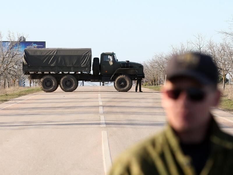 Soldaten blockieren den Zugang zu einem ukrainischen Luftwaffenstützpunkt in Sewastopol. Foto: Zurab Kurtsikidze