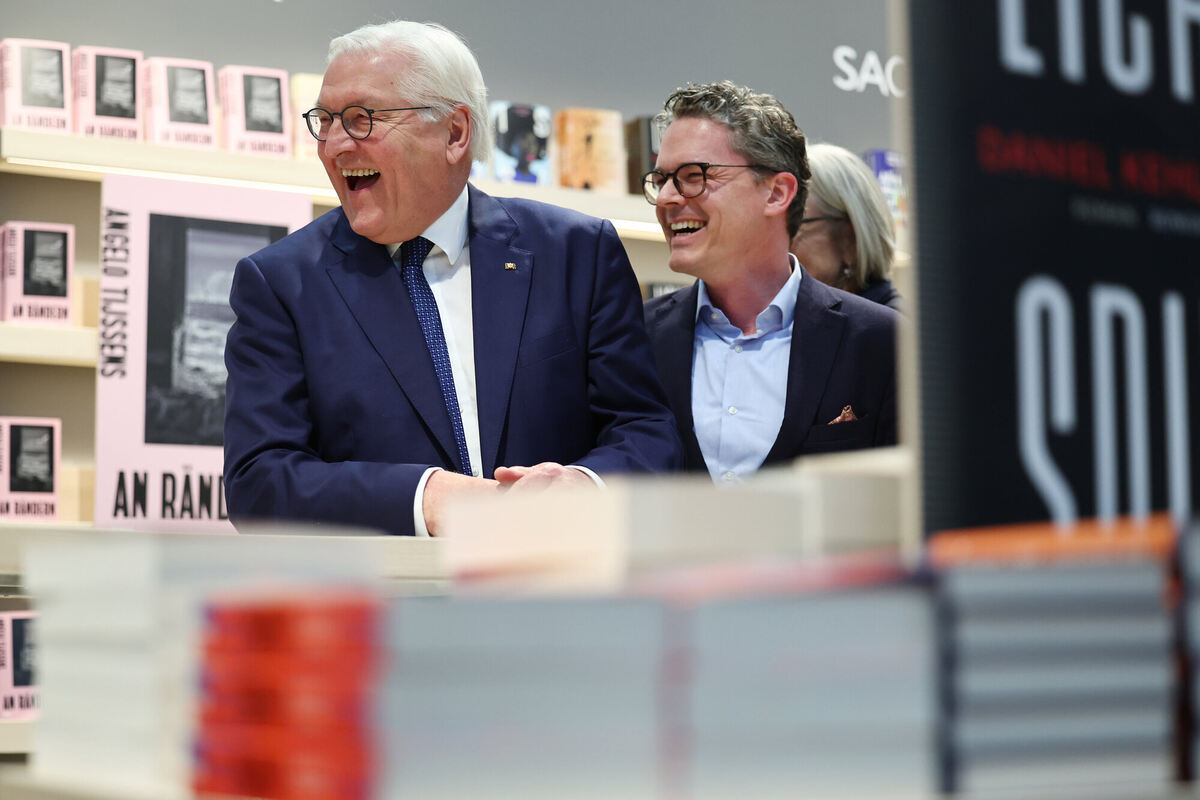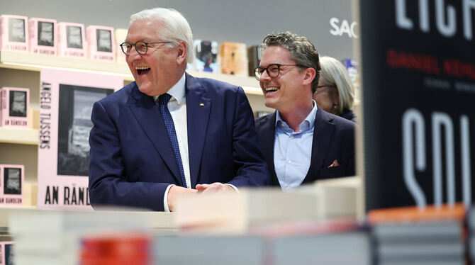 Ein gut gelaunter Bundespräsident (links) auf der Buchmesse. Neben ihm Christian Jünger, Geschäftsführer des Rowohlt-Verlages. FOTO: WOITAS/DPA