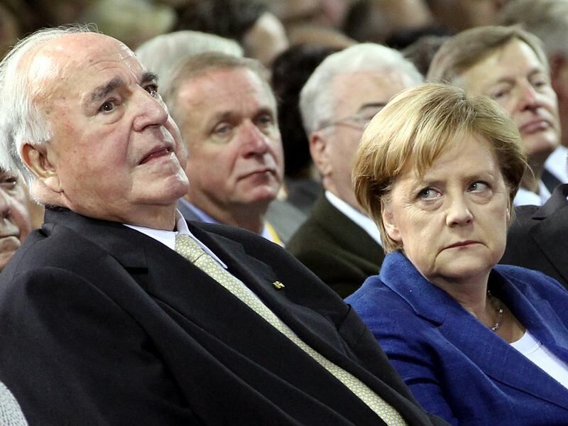 Altkanzler Helmut Kohl und Bundeskanzlerin Angela Merkel bei einem Empfang in Berlin.