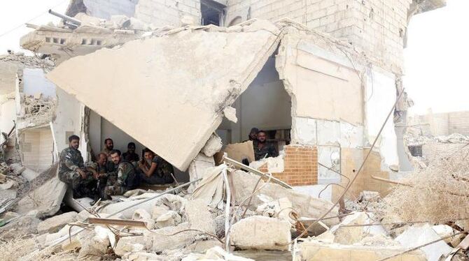 Totale Zerstörung: Syrische Soldaten in den Trümmern eines völlig verwüsteten Gebäudes. Foto: Youssef Badawi