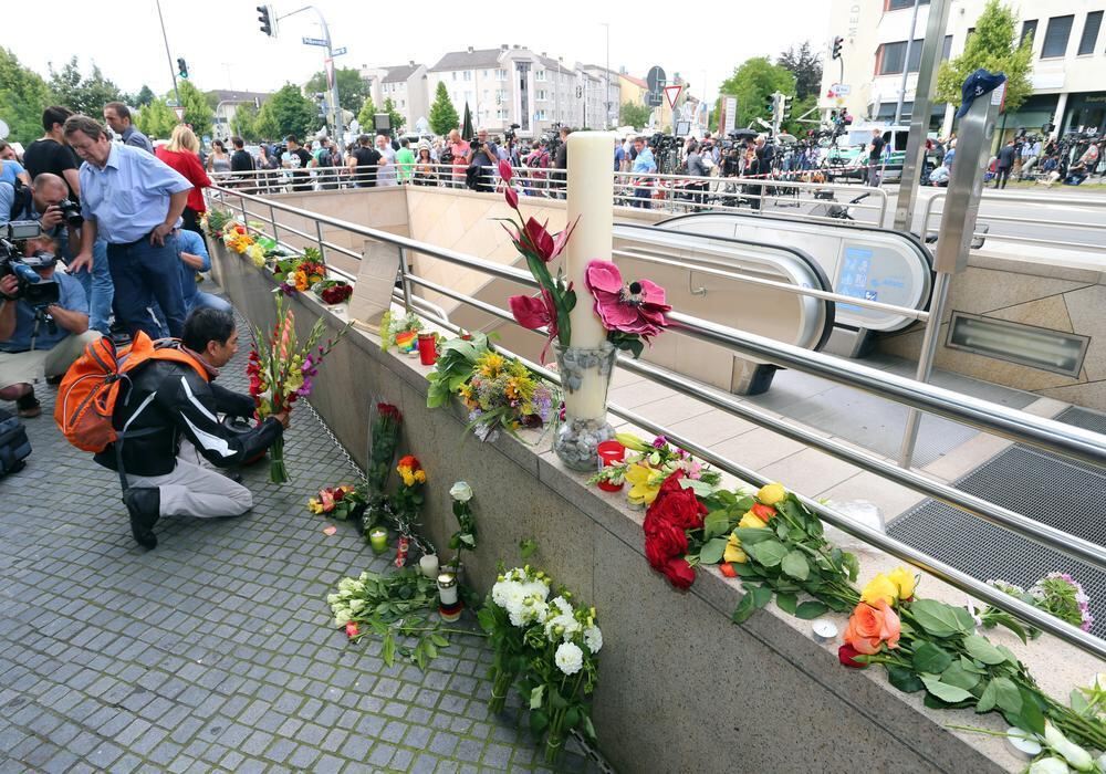 Paulus Son (links), dessen Tochter im Olympia-Einkaufszentrum arbeitet und unverletzt geblieben ist, legt am Zugang zur U-Bahnstation Olympia-Einkaufszentrum in München (Bayern) Blumen nieder.
