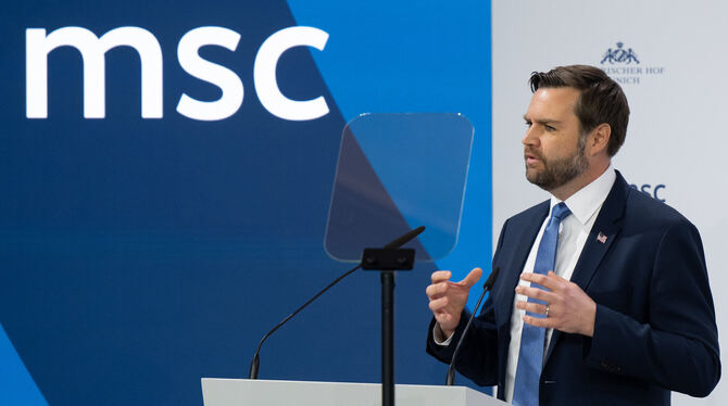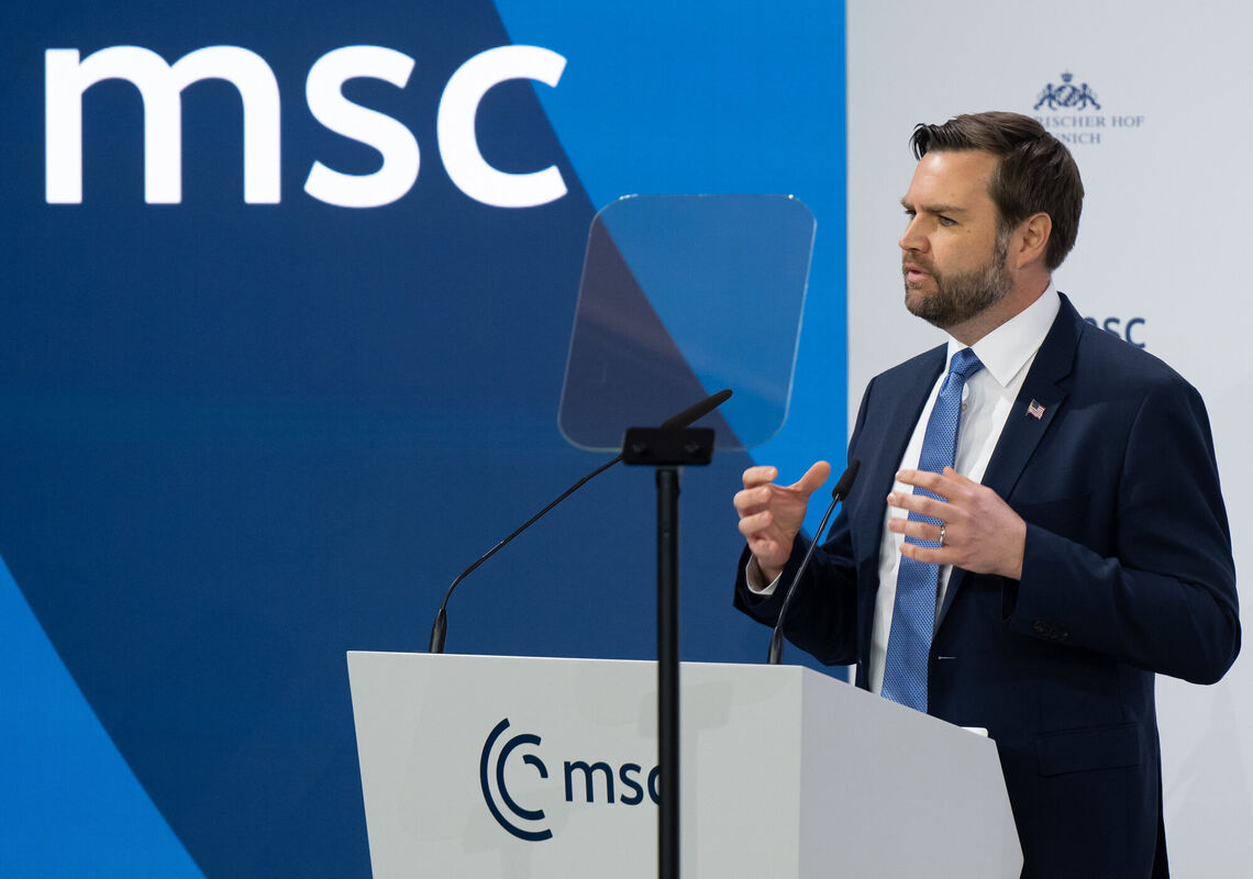 J.D. Vance, Vizepräsident der Vereinigten Staaten von Amerika, spricht bei der Münchner Sicherheitskonferenz. Die 61. Münchner Sicherheitskonferenz (MSC) findet vom 14. bis zum 16. Februar 2025 im Hotel Bayerischer Hof in München statt.