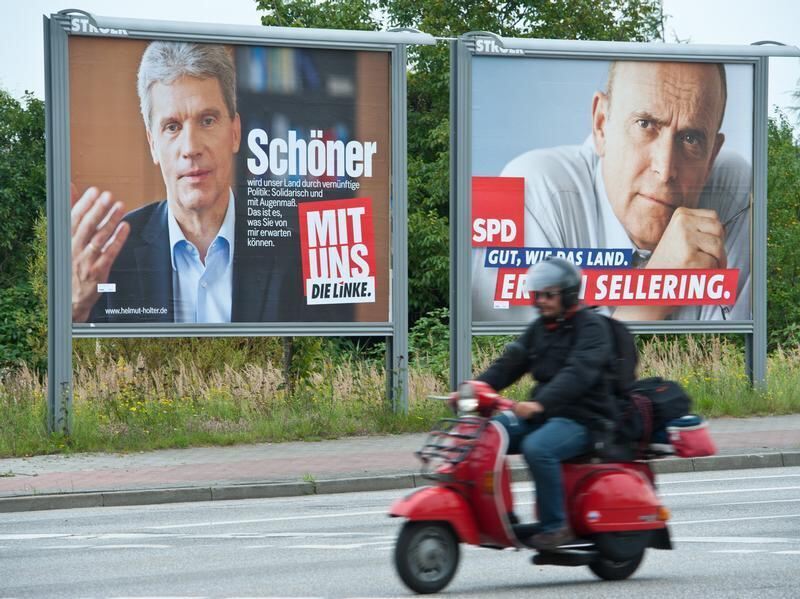 Die Porträts der Spitzenkandidaten der Partei Die Linke, Helmut Holter (l), und der SPD, Erwin Sellering werben auf großen Wahlplakaten in Stralsund für ihre Parteien.