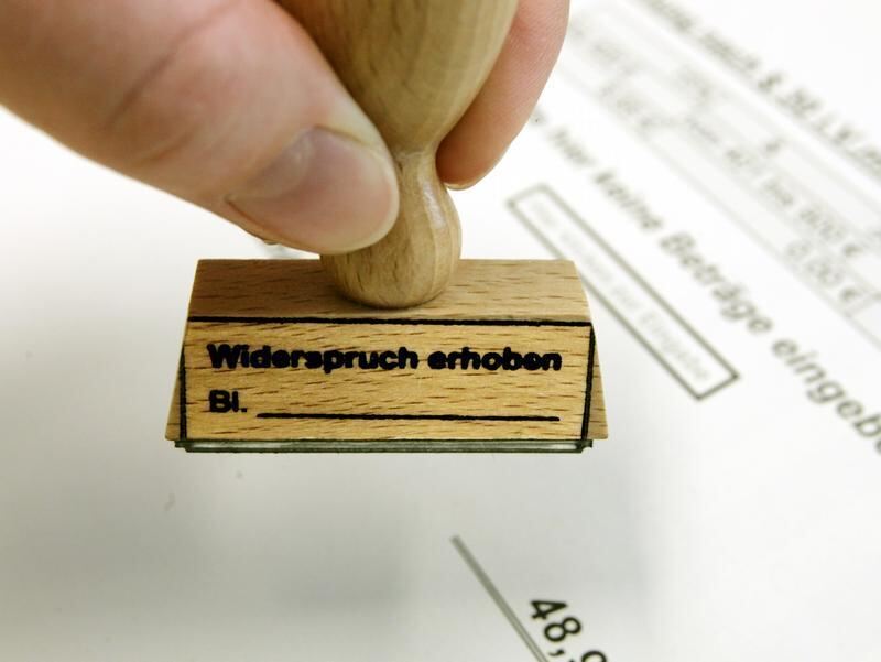 In der Widerspruchsstelle für Hartz IV der Arbeitsgemeinschaft Leipzig hält eine Mitarbeiterin einen Stempel für Eingänge von Widersprüchen in der Hand.