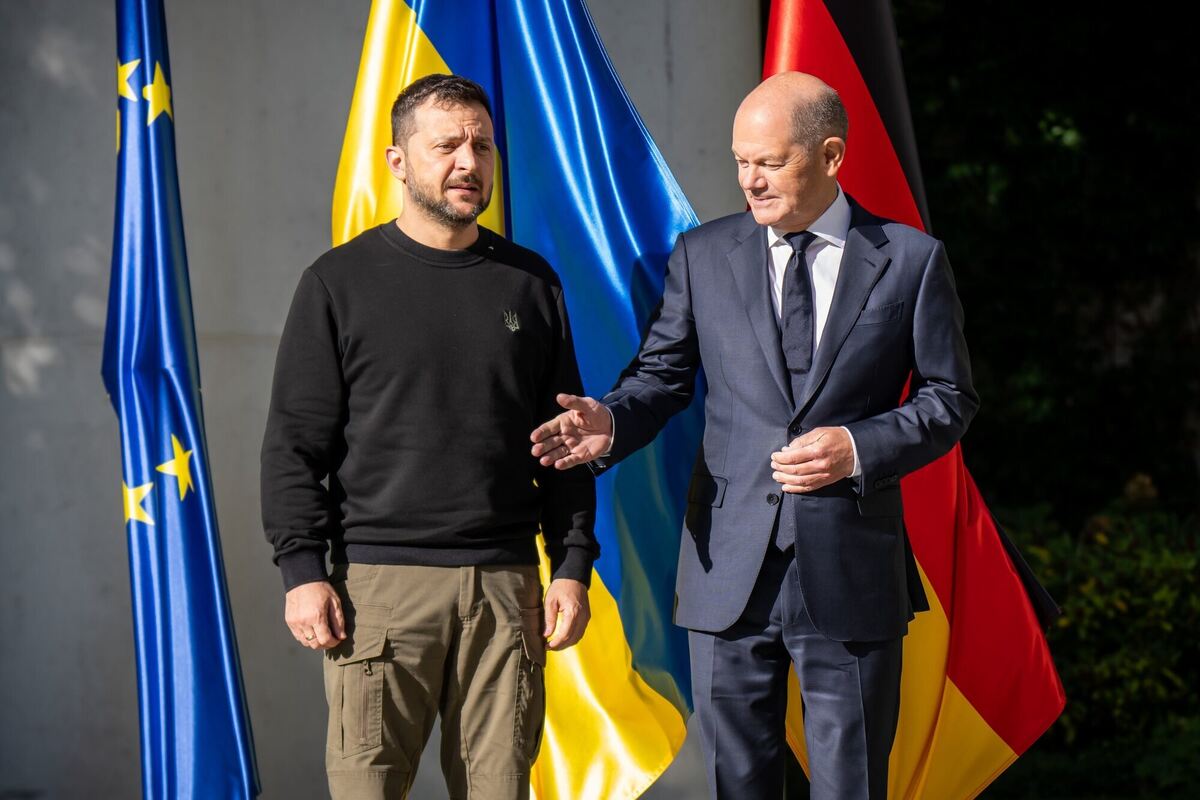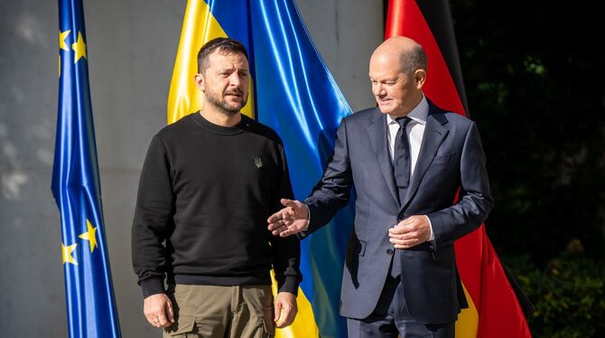 Bundeskanzler Olaf Scholz sichert Wolodymyr Selenskyj (links), Präsident der Ukraine, weitere Hilfe zu.